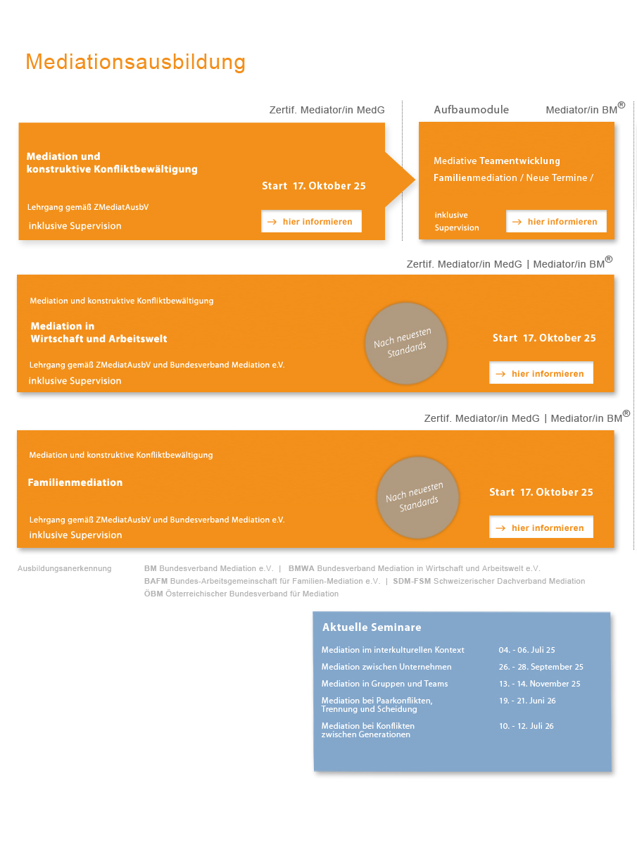 Diese Einsicht vermitteln wir in unseren Lehrgängen - durch eine fundierte Ausbildung mit erfahrenen ReferentInnen, die alle schon seit vielen Jahren MediatorInnen im In- und Ausland ausbilden, sowie mit bewährten Kursunterlagen.